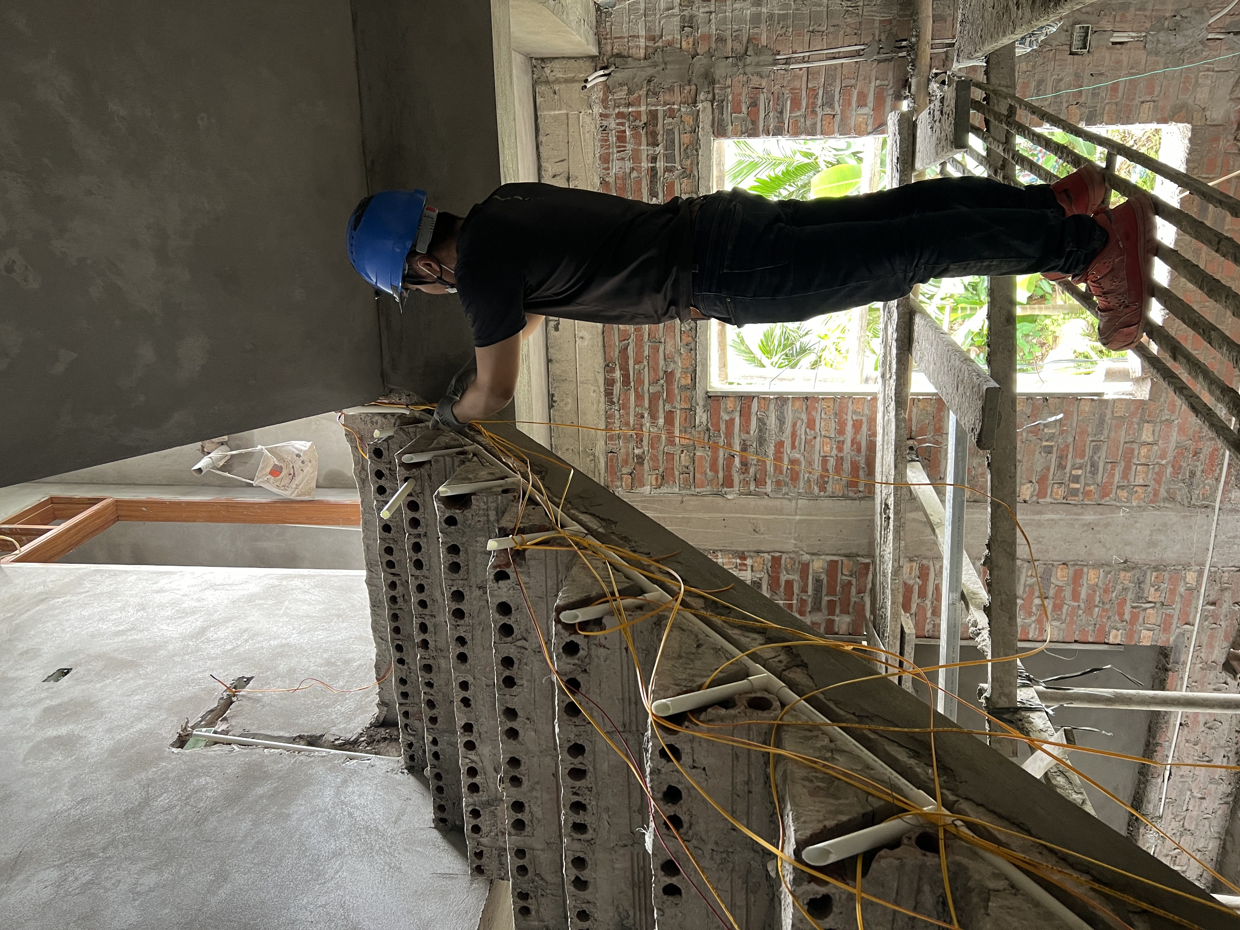 Nhân viên kỹ thuật đi dây chờ trước, mỗi bậc chờ 2 dây, 2 cảm biến đầu và cuối cầu thang chờ 3 dây