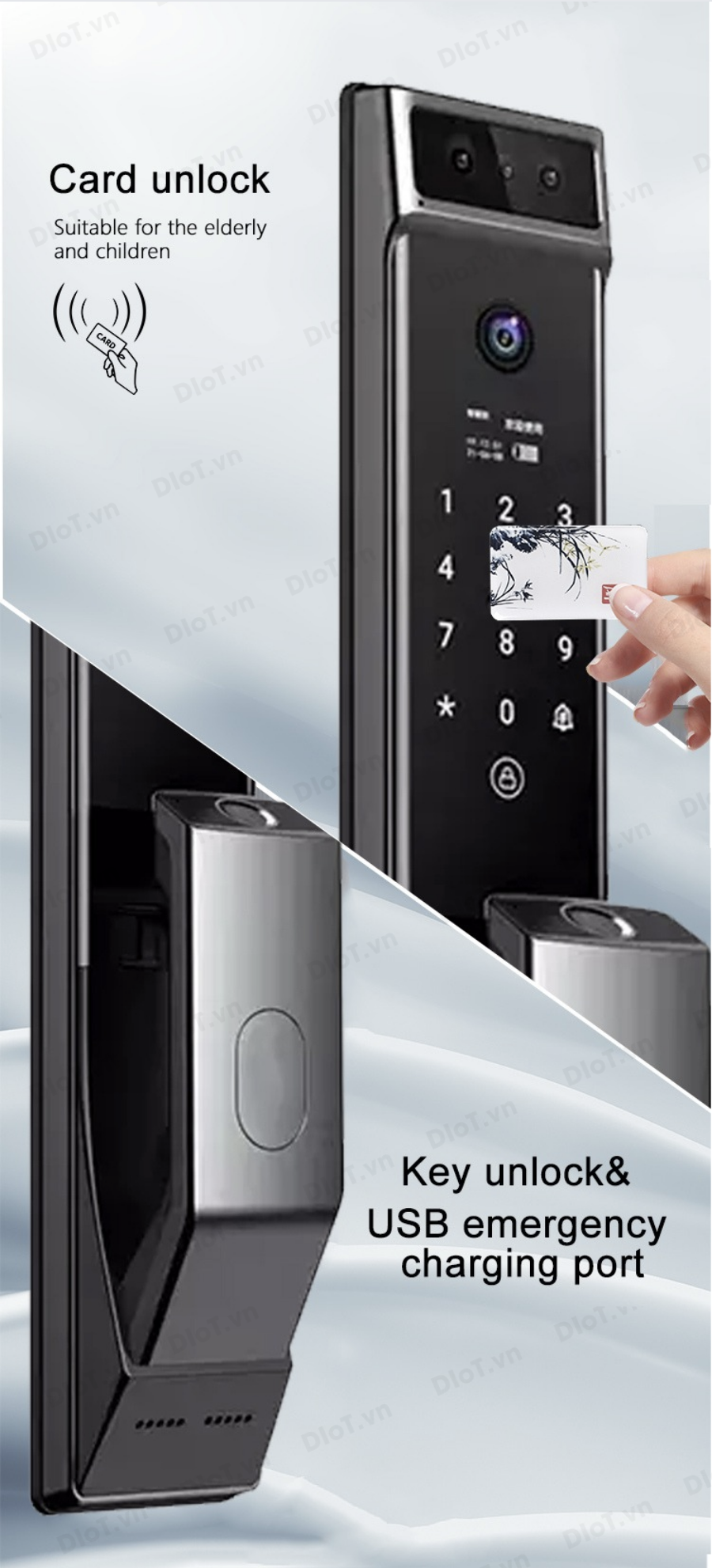 • Chức năng mở khóa: Vân tay, mật khẩu, quẹt thẻ, chìa khóa cơ, nhận dạng khuôn mặt, điều khiển từ xa điện thoại di động