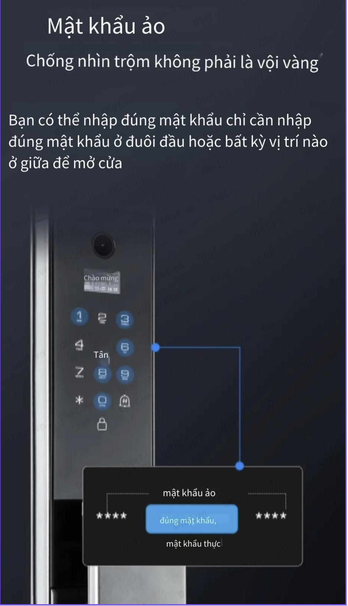 +Công nghệ mã số ảo kết hợp với dãy số mật khẩu đúng, hỗ trợ bạn có thể nhập thoải mái mật khẩu mà không cần phải lo ngại ai dòm ngó nhìn trộm đánh cắp mật khẩu