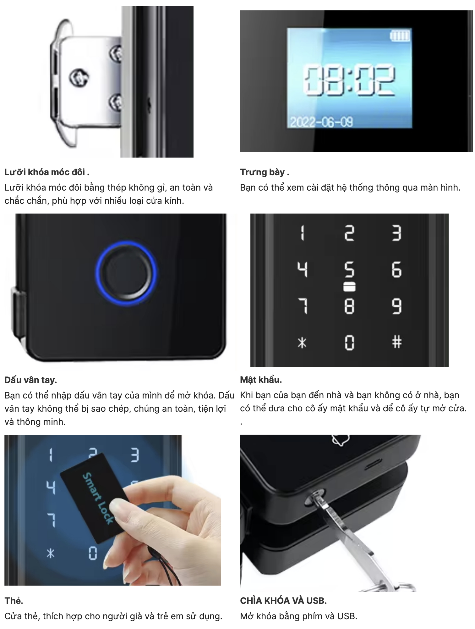 Hỗ trợ lên tới: 1000 mật khẩu, 100 vân tay, 1000 thẻ từ