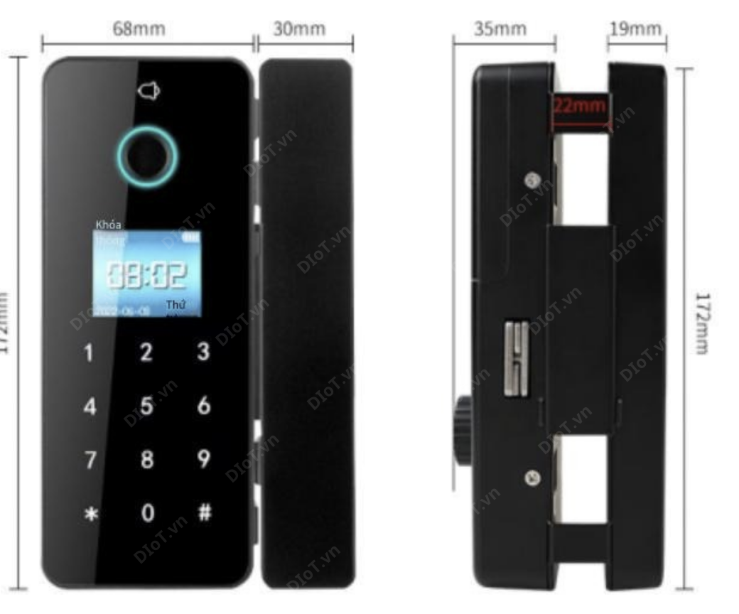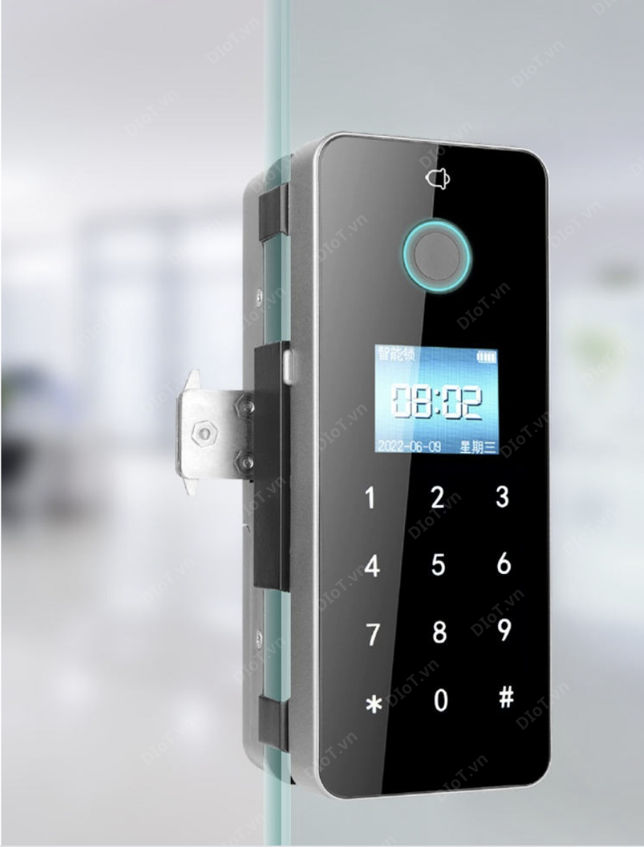 Cảm biến vân tay điện dung: Khoá vân tay chuyên lắp cho cửa kính lưu trữ đồng thời 100 vân tay, tốc độ nhận diện 0,02s.